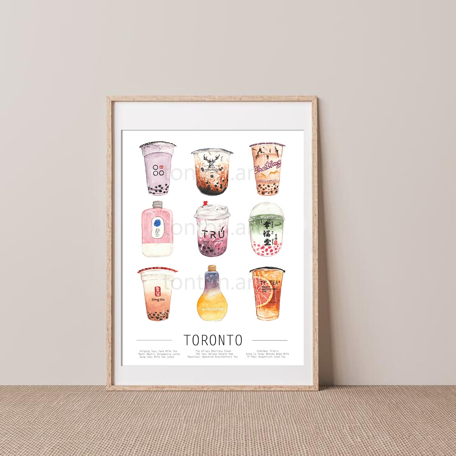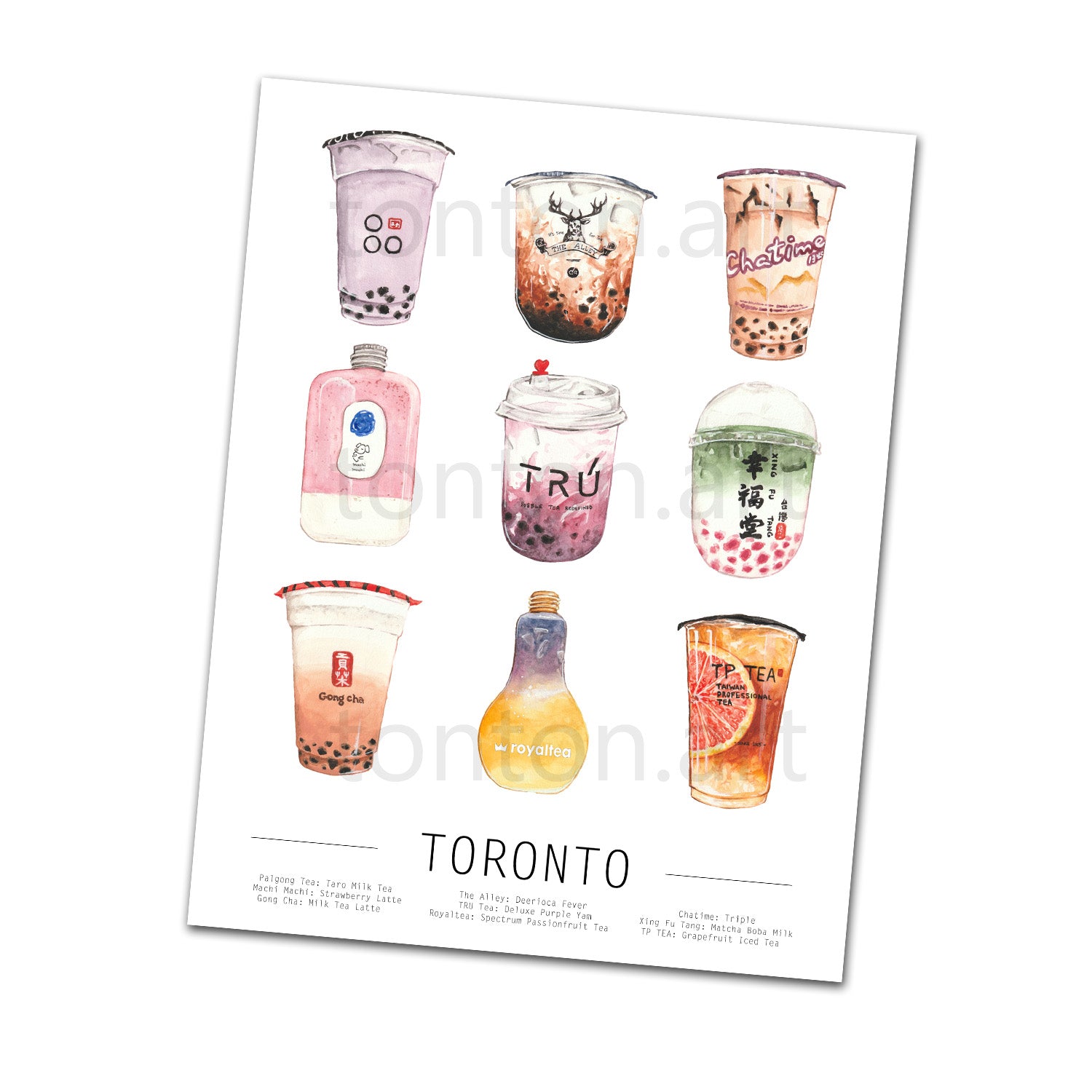Art print featuring a collection of my favorite boba places in Toronto! Archival ink on high quality matte paper Dimensions: