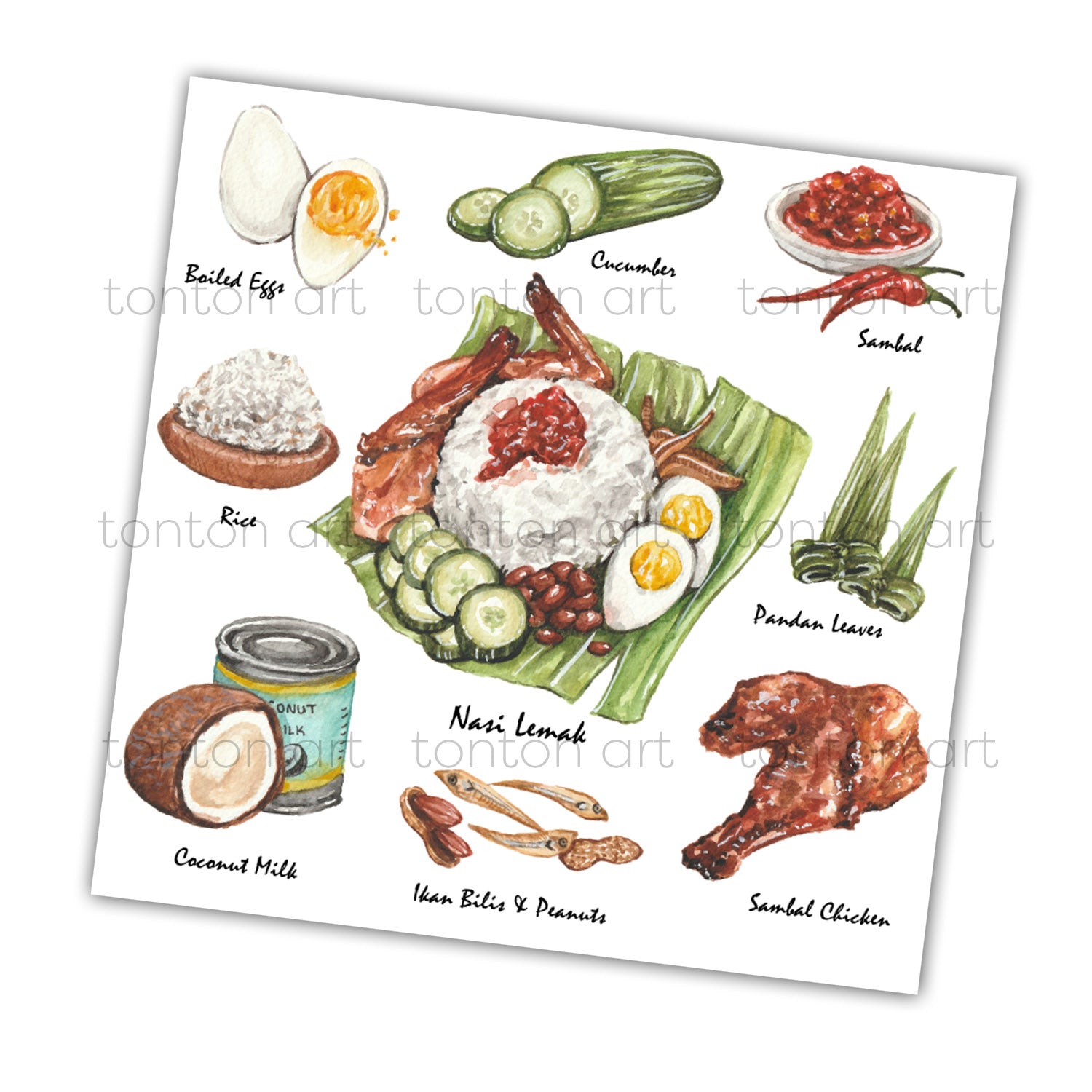 Part of my recipe project, featuring my painting of Nasi Lemak and its ingredients!