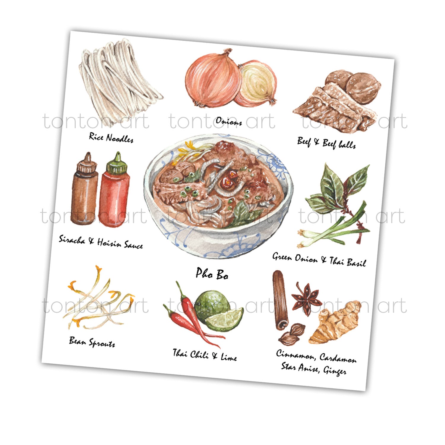 Part of my recipe project, featuring my painting of a bowl of Pho Bo and its ingredients!