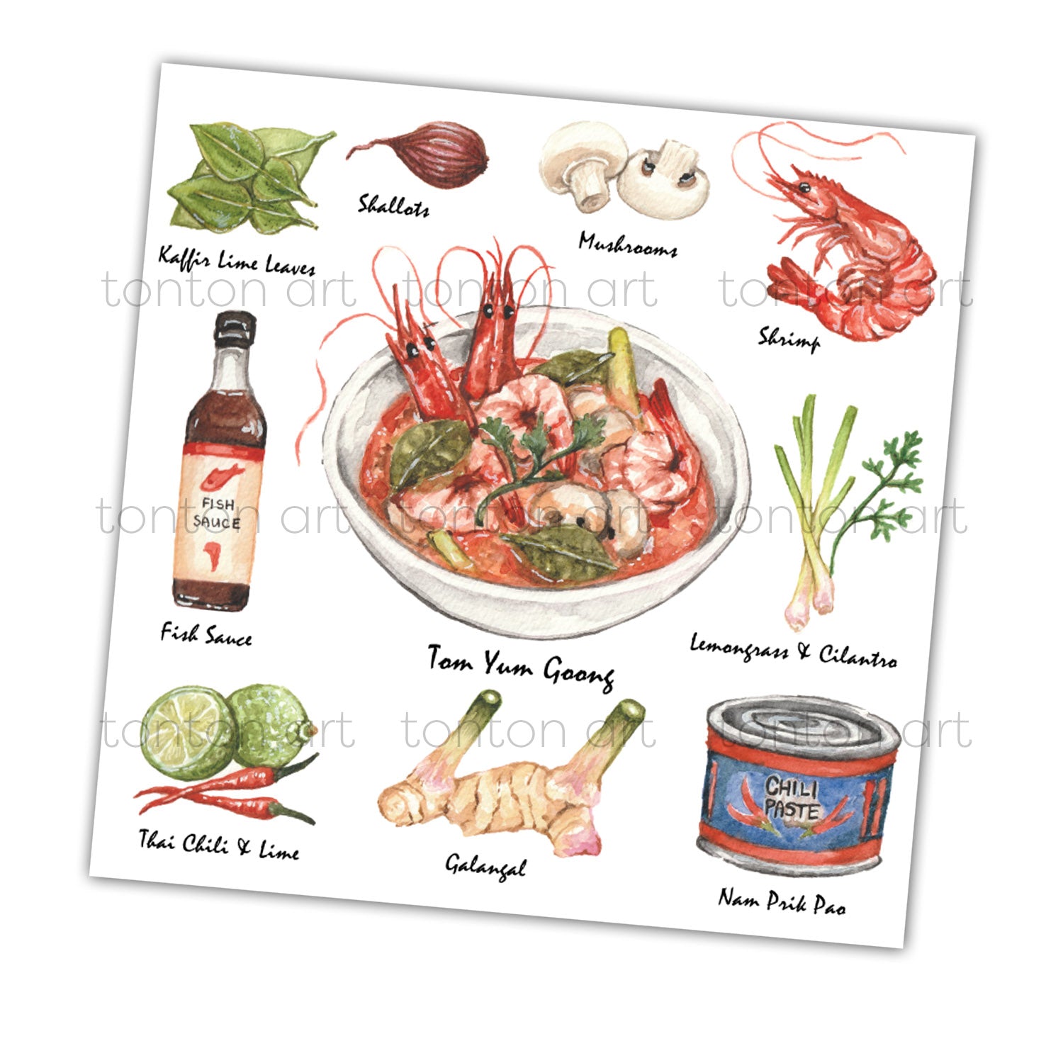 Part of my recipe project, featuring my painting of tom yum soup and its ingredients!