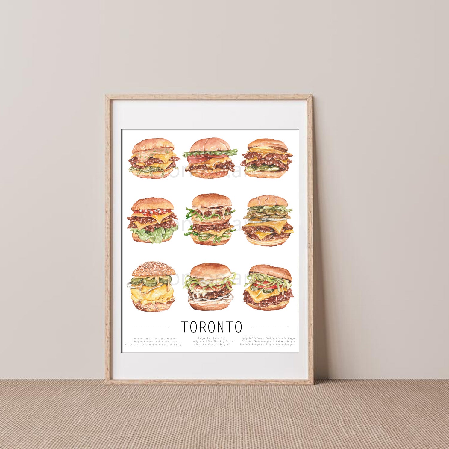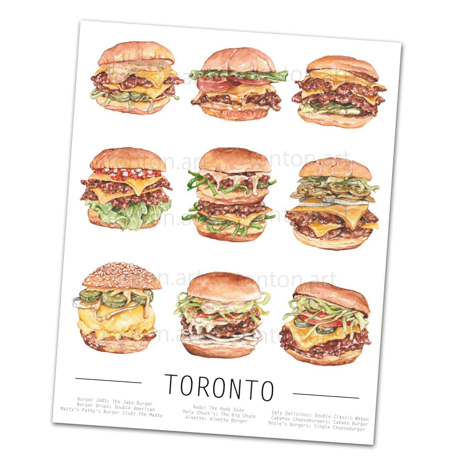 Art print featuring a collection of my favorite Burger Spots in Toronto! Archival ink on high quality matte paper