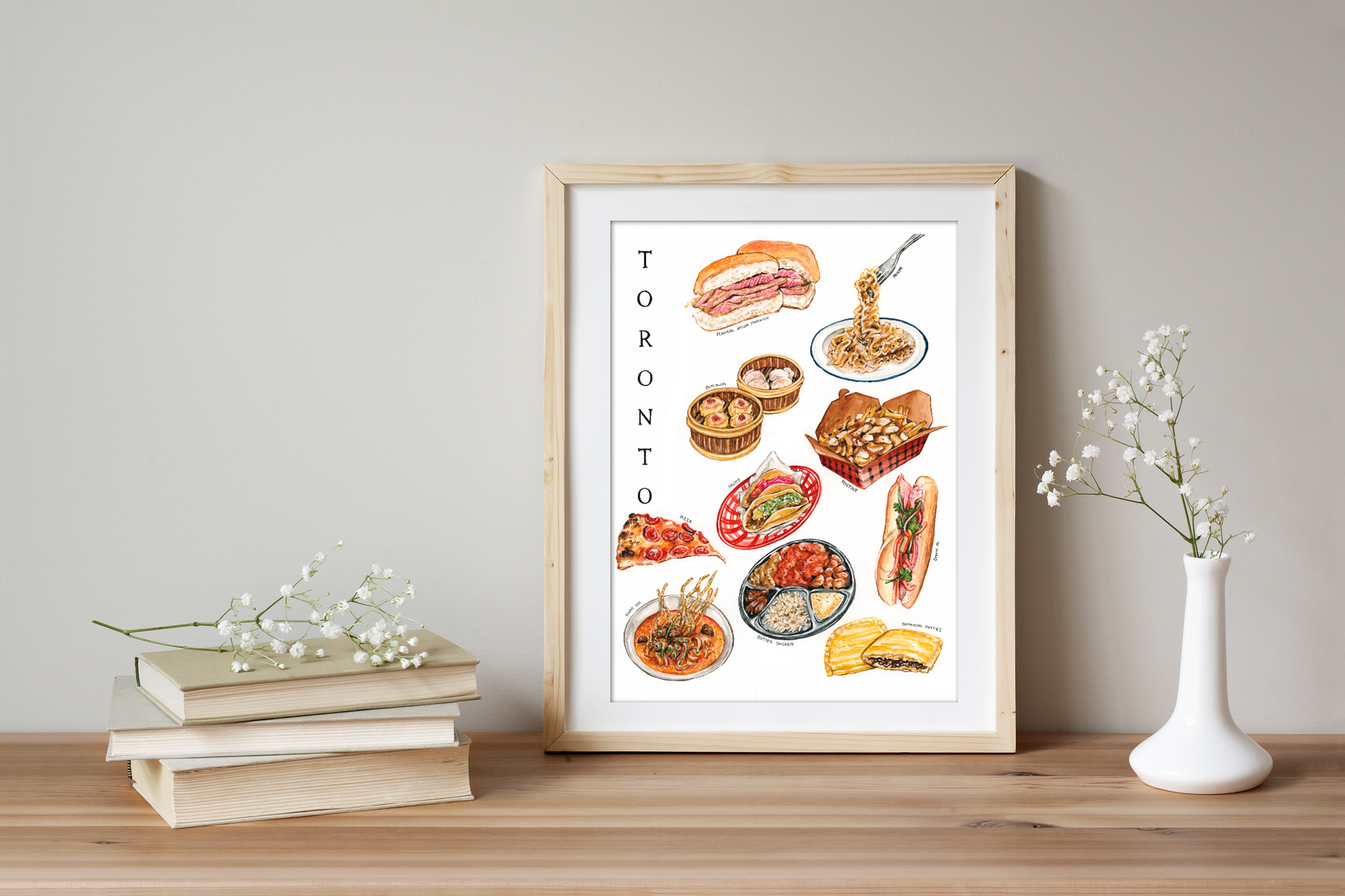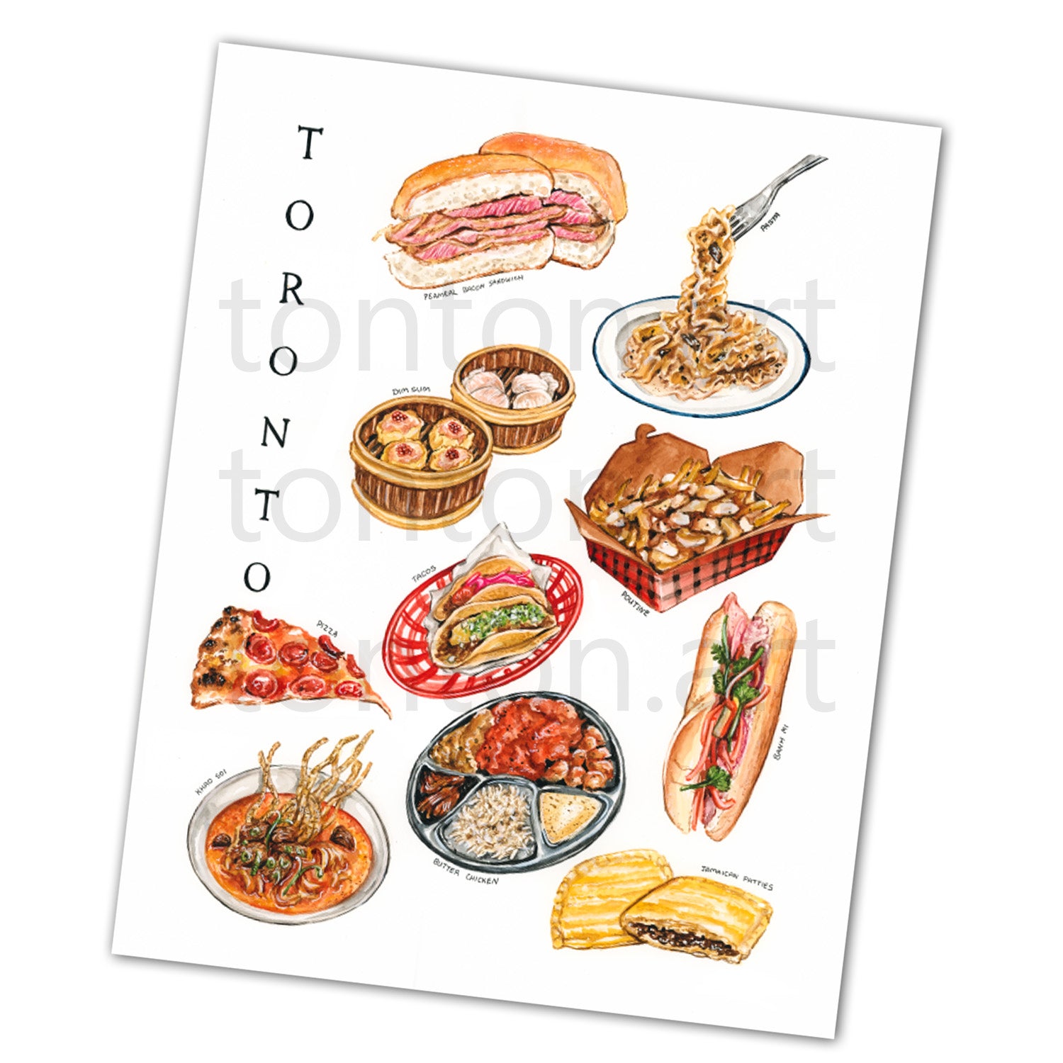 Art print featuring a collection food that I feel greatly represents Toronto! Archival ink on high quality matte paper